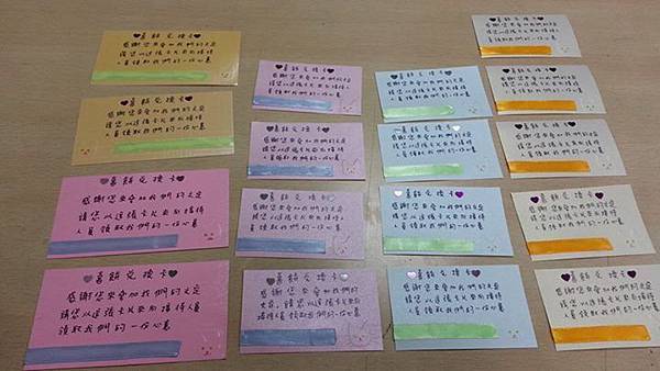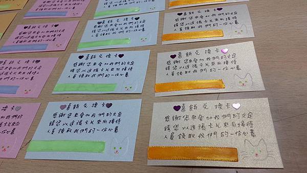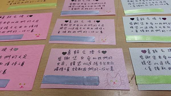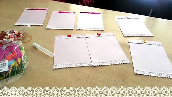 所以我幫粉紅色的卡片都配了粉藍色緞帶,
